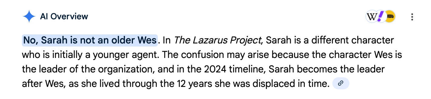 For instance, I wanted to see what “people were saying” about the ending of a TV series I loved (The Lazarus Project). I wondered who also may have theorized about the relationship between two of the characters. And, welp, Google’s Gemini cut me right off. “No” it said. End of story.